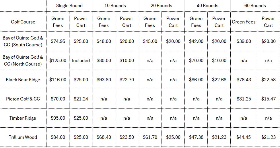 Trillium Wood Golf Club, Picton Golf & Country Club, and Black Bear Ridge Golf Resort offer an “Unlimited Play” membership, which can bring the cost to play golf down even more than indicated in their 60-round rate. The other courses have limits on their membership packages but offer additional rounds for very reasonable rates.
